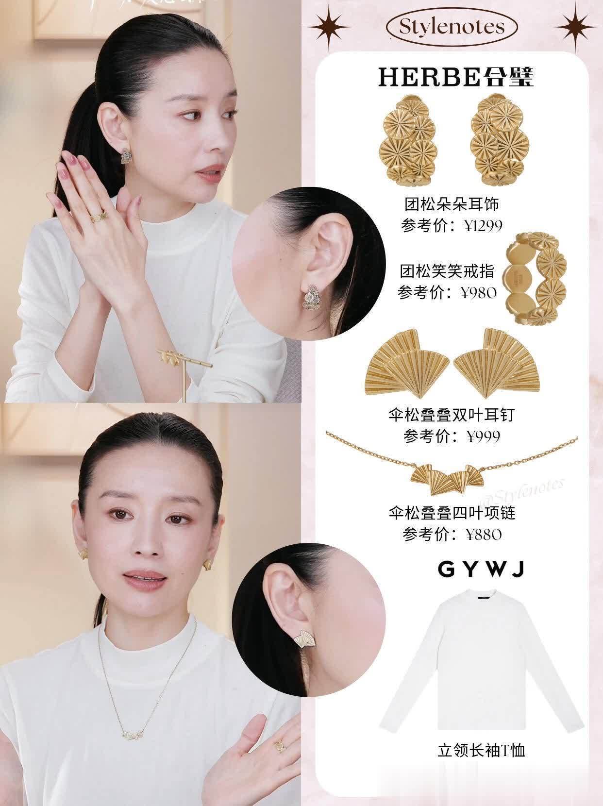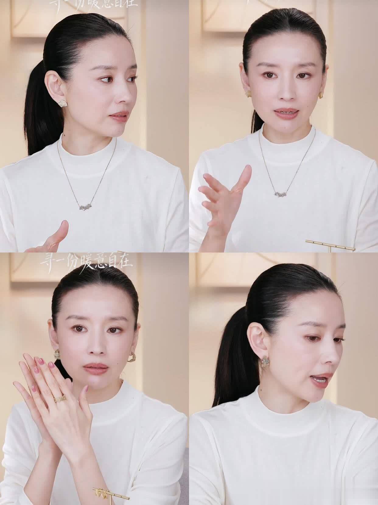 这次的配饰更是细节控狂喜!古铜浅金色的项链和耳环,远看像块温润的老玉,近看才发现藏着中式团松和扇叶图案,纹路细得像工笔画。最绝的是在不同光线下会变色,自然光里带点暖调,室内灯光下又泛着冷光,戴在脖子上不抢眼,却总在转头时闪一下微光,这种“低调的精致”真的太戳人了。不像有的配饰恨不得把“贵”字写在脸上,董洁选的这些小物件,更像给穿搭加了层柔光滤镜,润物细无声地提气质。