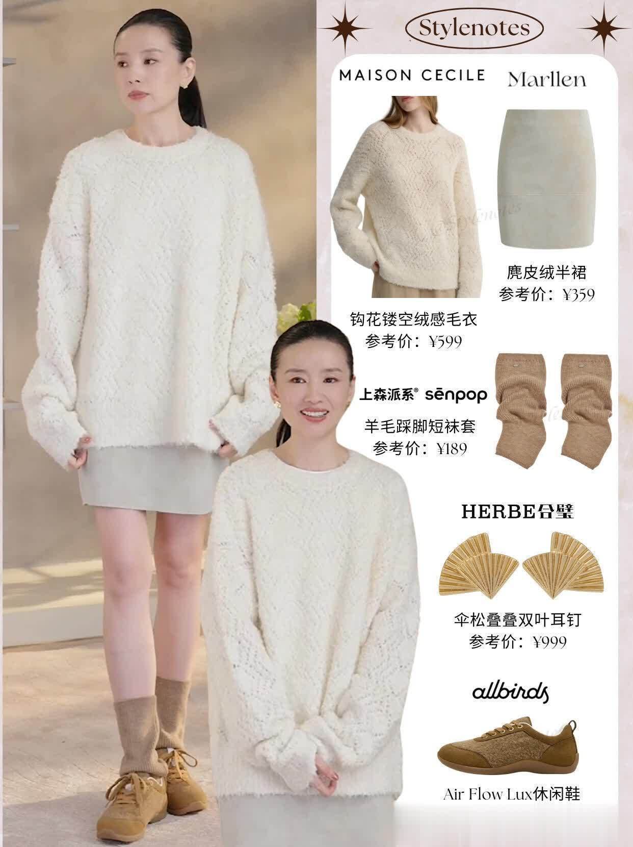 绒感毛衣配麂皮半裙那套更绝,温柔得像刚沏好的桂花乌龙!毛衣是奶白色的,毛茸茸的质感隔着屏幕都能感受到,袖口卷到小臂,露出细手腕,显得人特别纤薄。下面搭条深棕色麂皮半裙,裙摆到膝盖下方,走路时轻轻晃,麂皮的光泽在灯光下忽明忽暗,复古感直接拉满。她踩了双棕色短靴,靴口和裙摆之间露出点小腿,比例拿捏得刚刚好,弹幕里全在刷“这才是秋冬该有的温柔”。我试着用家里的旧毛衣搭麂皮裙,居然也有那味儿,原来重点在“软质毛衣配挺括半裙”,刚柔相济才显质感。